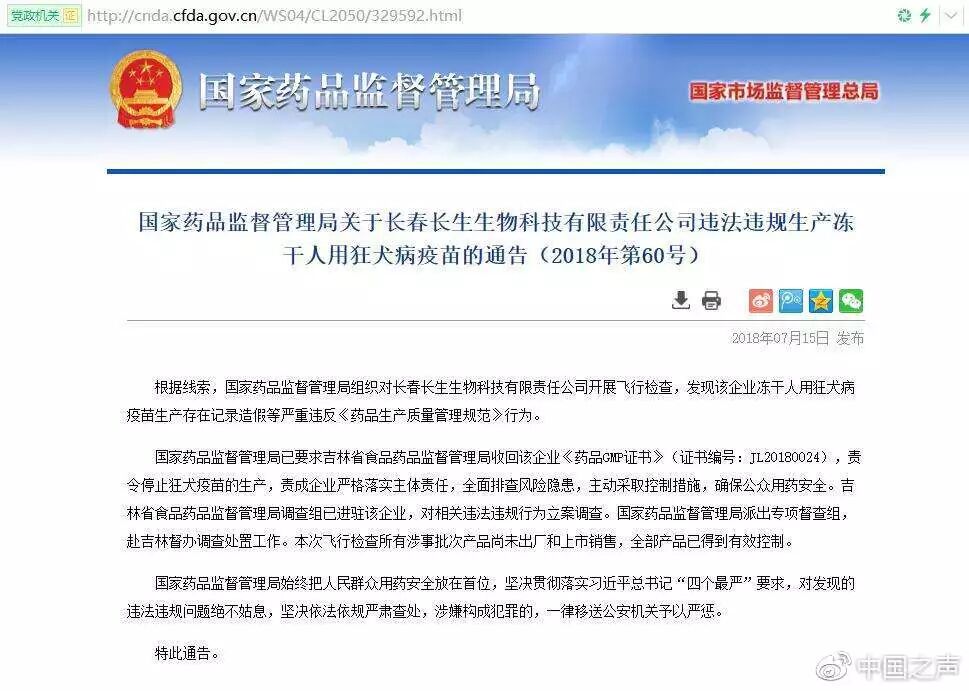 7月15日,国家药监局称,近期查获一批生产记录造假的狂犬疫苗,长春长生生物科技有限责任公司的冻干人用狂犬病疫苗生产存在记录造假等严重违反《药品生产质量管理规范》行为。