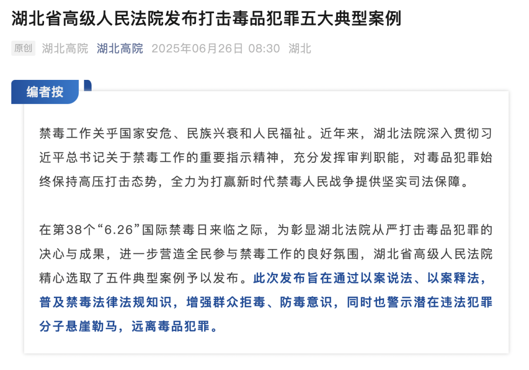 6月26日“国际禁毒日”当天,湖北省高级法院发布5起打击毒品犯罪典型案例,其中包括“李某因吸食毒品致幻后杀害三人,依法判处死刑”一案。